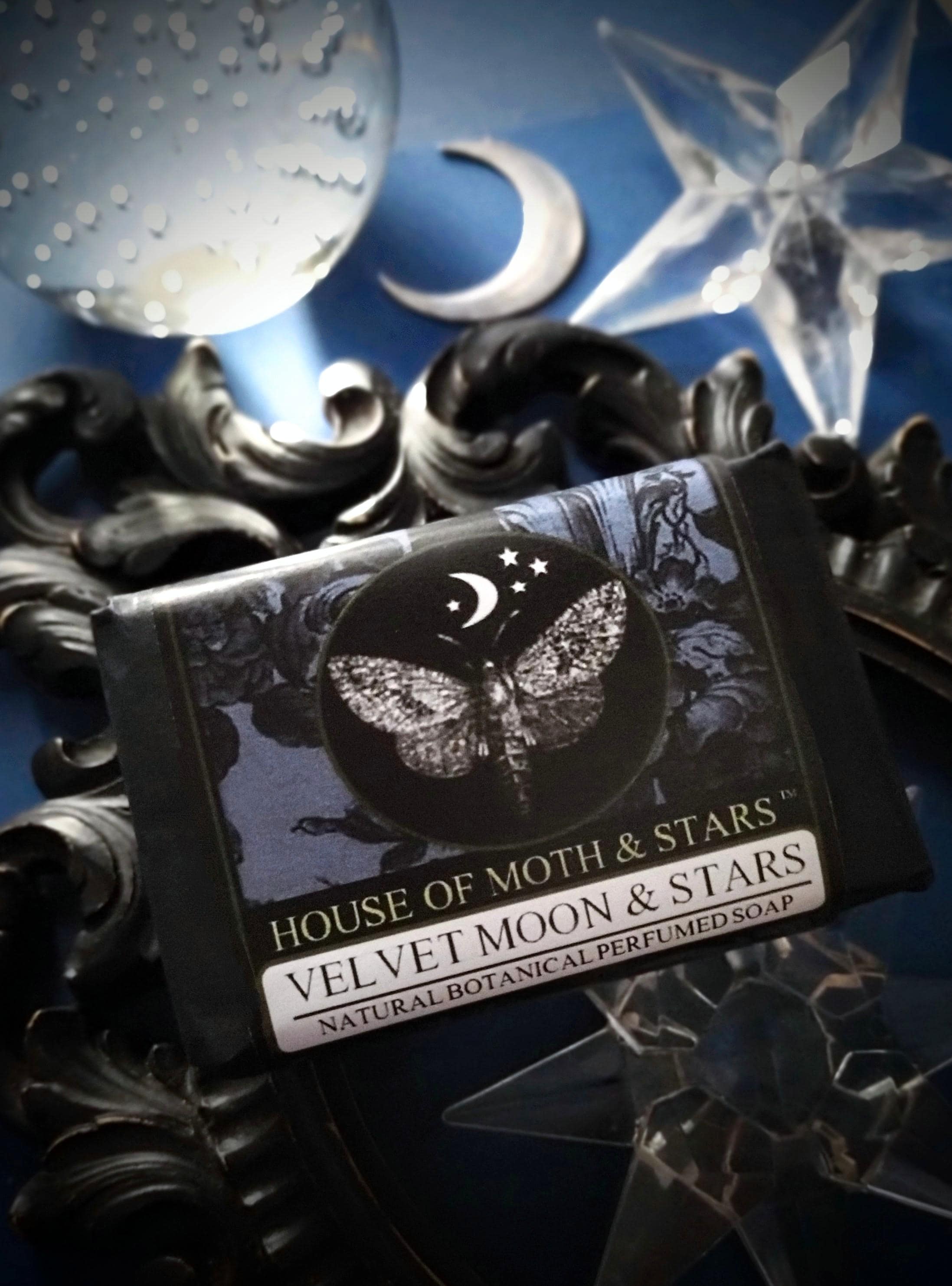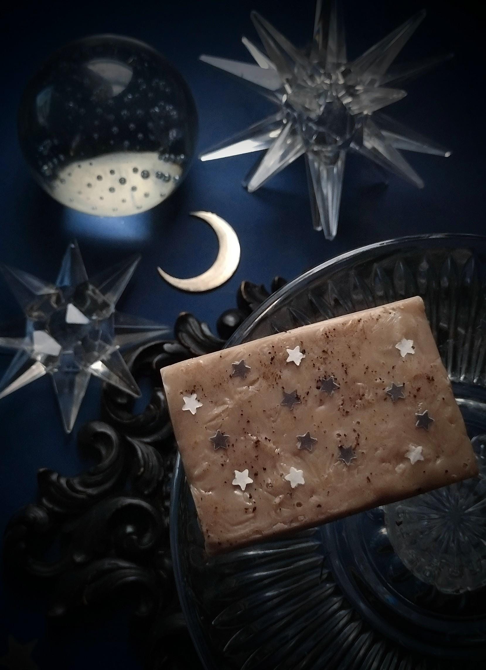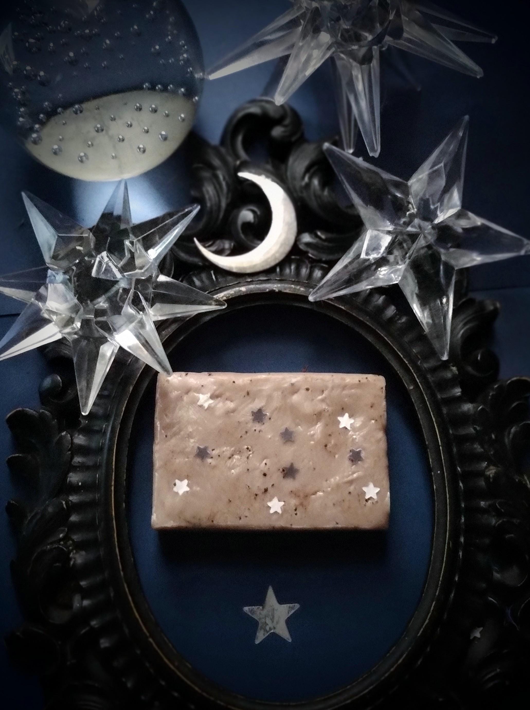 Ingredients: Olive Oil (Grade A extra virgin), Palm Oil, Coconut Oil, Grapeseed oil, Safflower Oil, Glycerin (kosher, of vegetable origin), Shea Butter, Purified Water, Sodium Hydroxide (saponifying agent), Sorbitol (moisturizer), Sorbitan oleate (emulsifier), Soybean Protein (conditioner). Naturally colored in Cocao Powder, Ground Coffee, Cloves, Essential Oils, Absolutes. Rice Paper Stars.