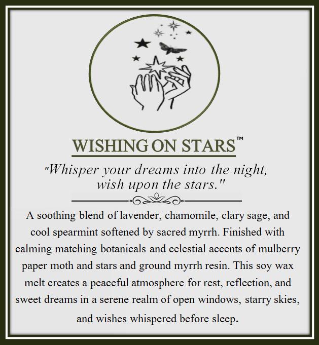 A soothing blend of lavender, chamomile, clary sage, and cool spearmint softened by sacred myrrh. Finished with calming matching botanicals and celestial accents of mulberry paper moth and stars and ground myrrh resin. This soy wax melt creates a peaceful atmosphere for rest, reflection, and sweet dreams in a serene realm of open windows, starry skies, and wishes whispered before sleep.