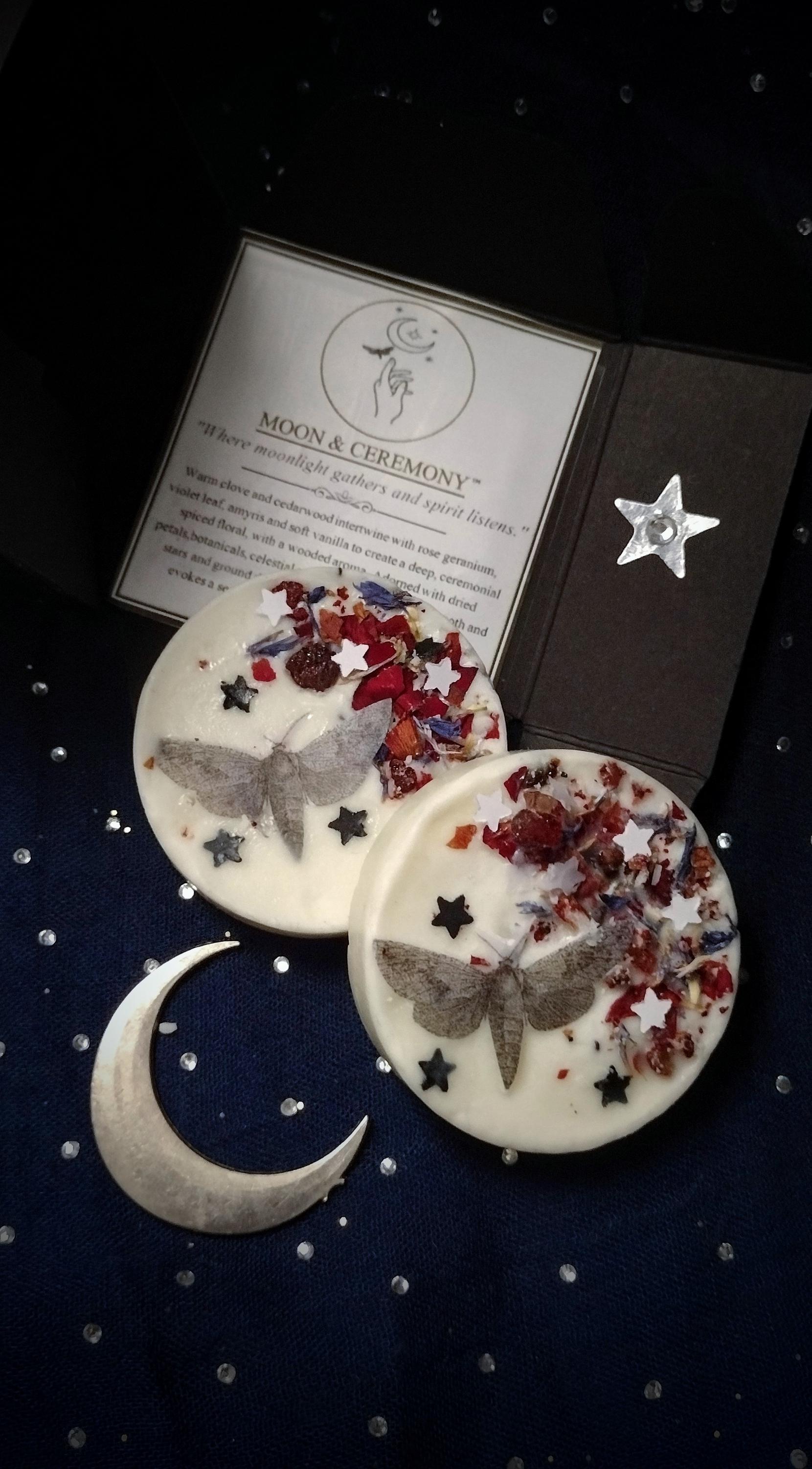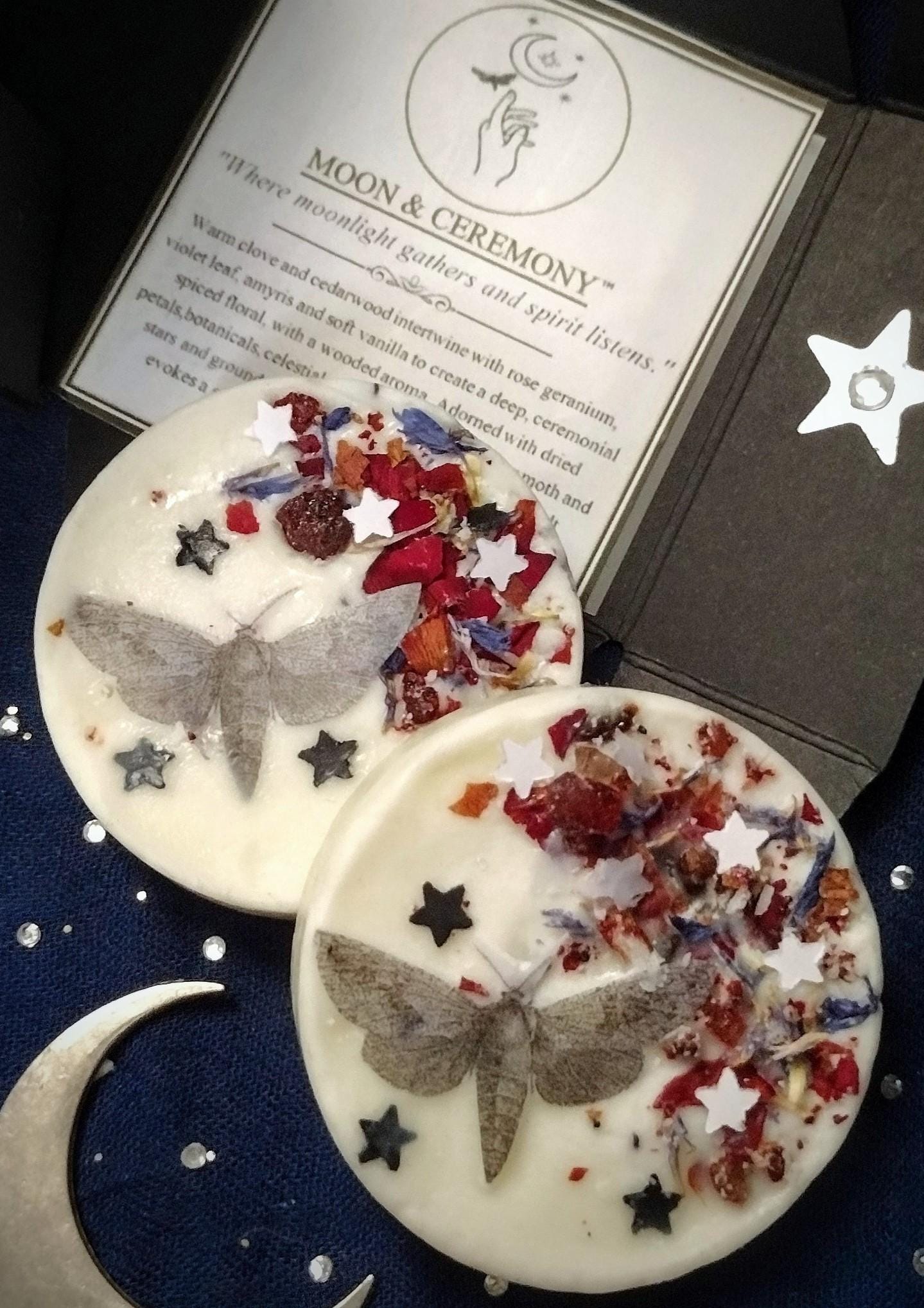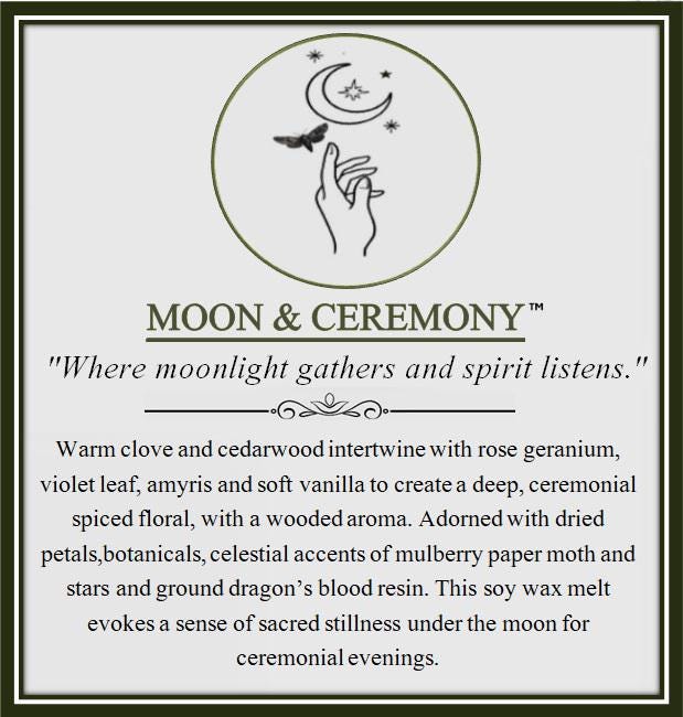 Warm clove and cedarwood intertwine with rose geranium, violet leaf, amyris and soft vanilla to create a deep, ceremonial spiced floral, with a wooded aroma. Adorned with dried petals, botanicals, celestial accents of mulberry paper moth and stars and ground dragon’s blood resin. This soy wax melt evokes a sense of sacred stillness under the moon for ceremonial evenings.