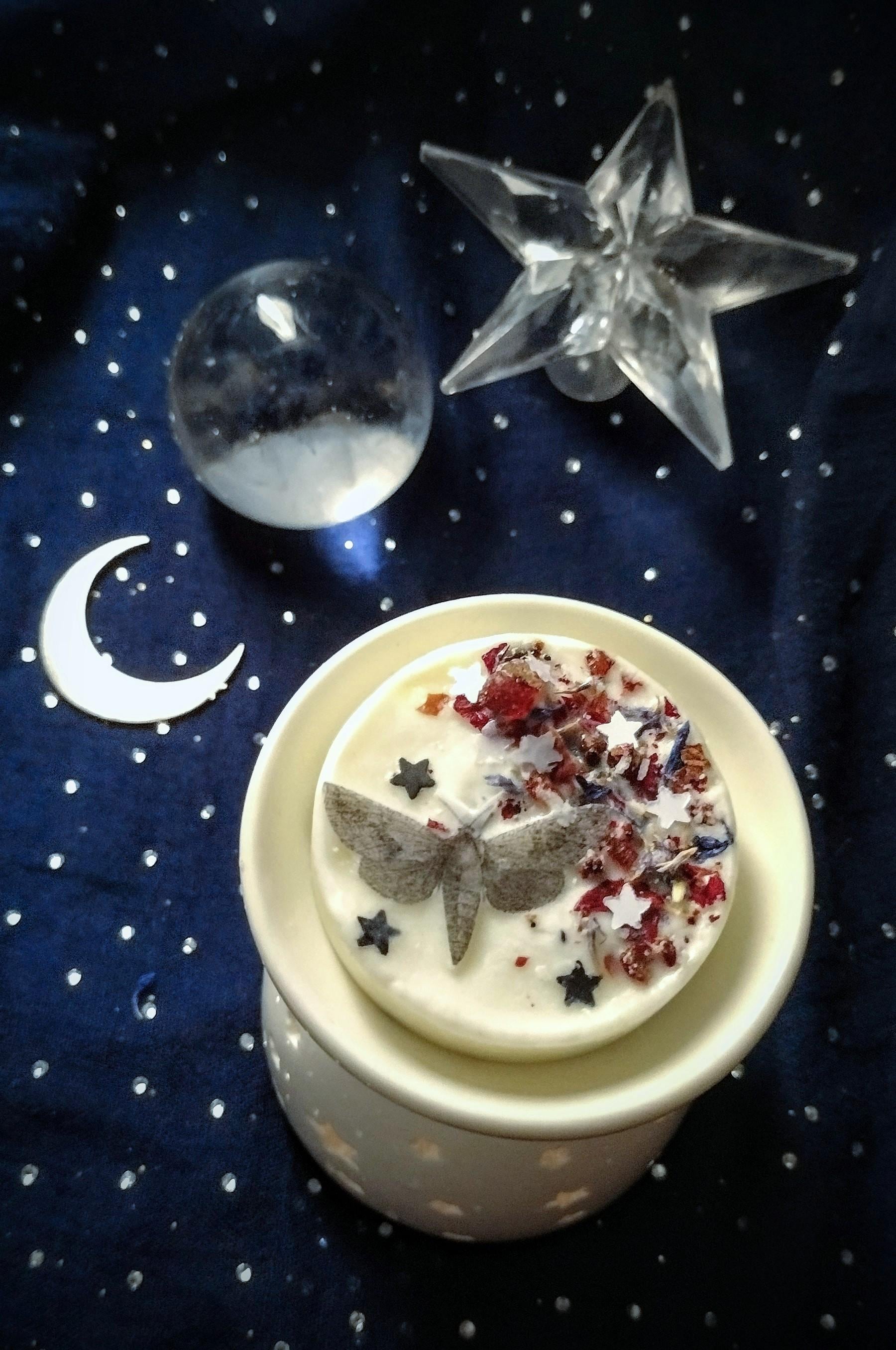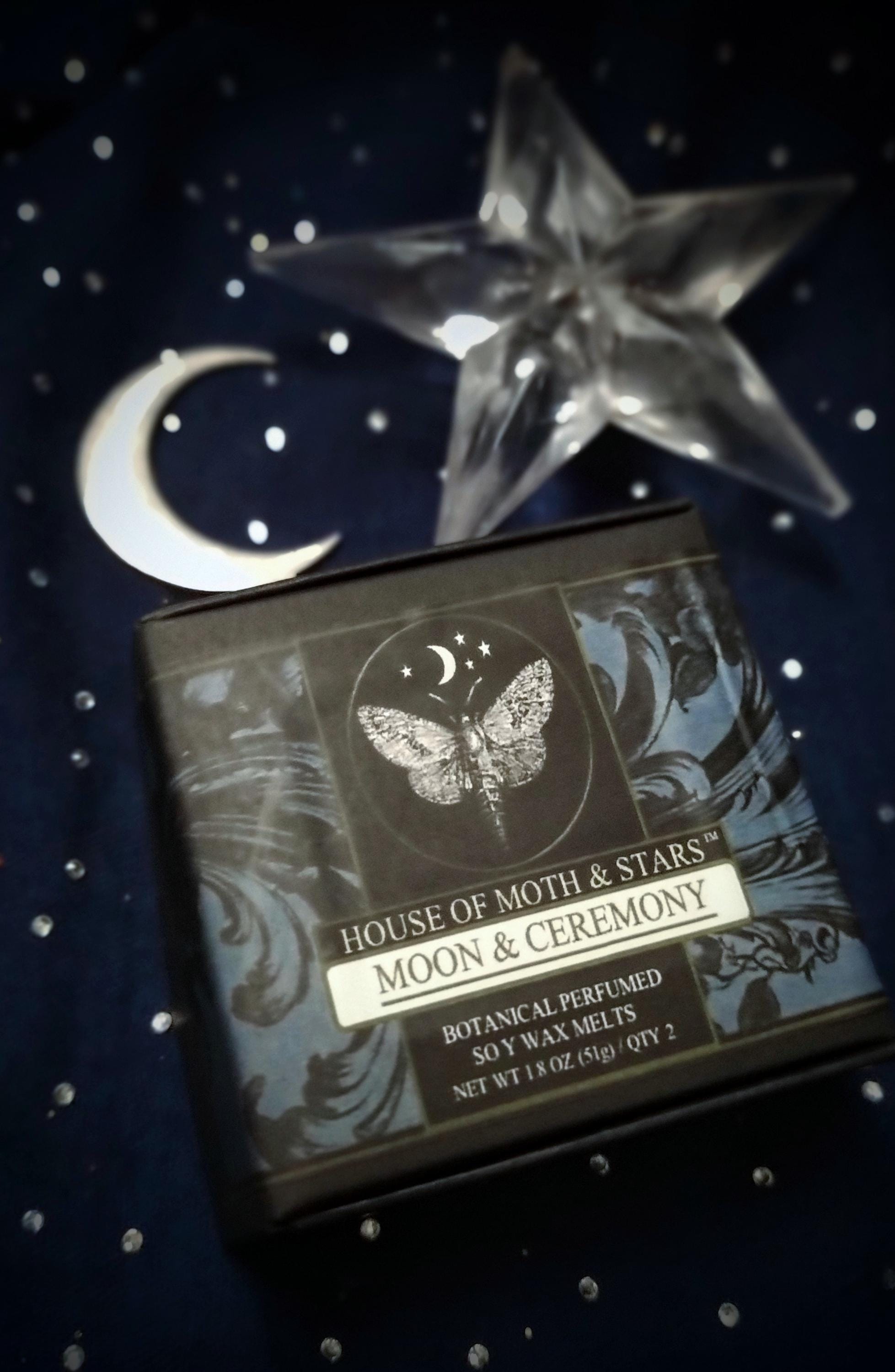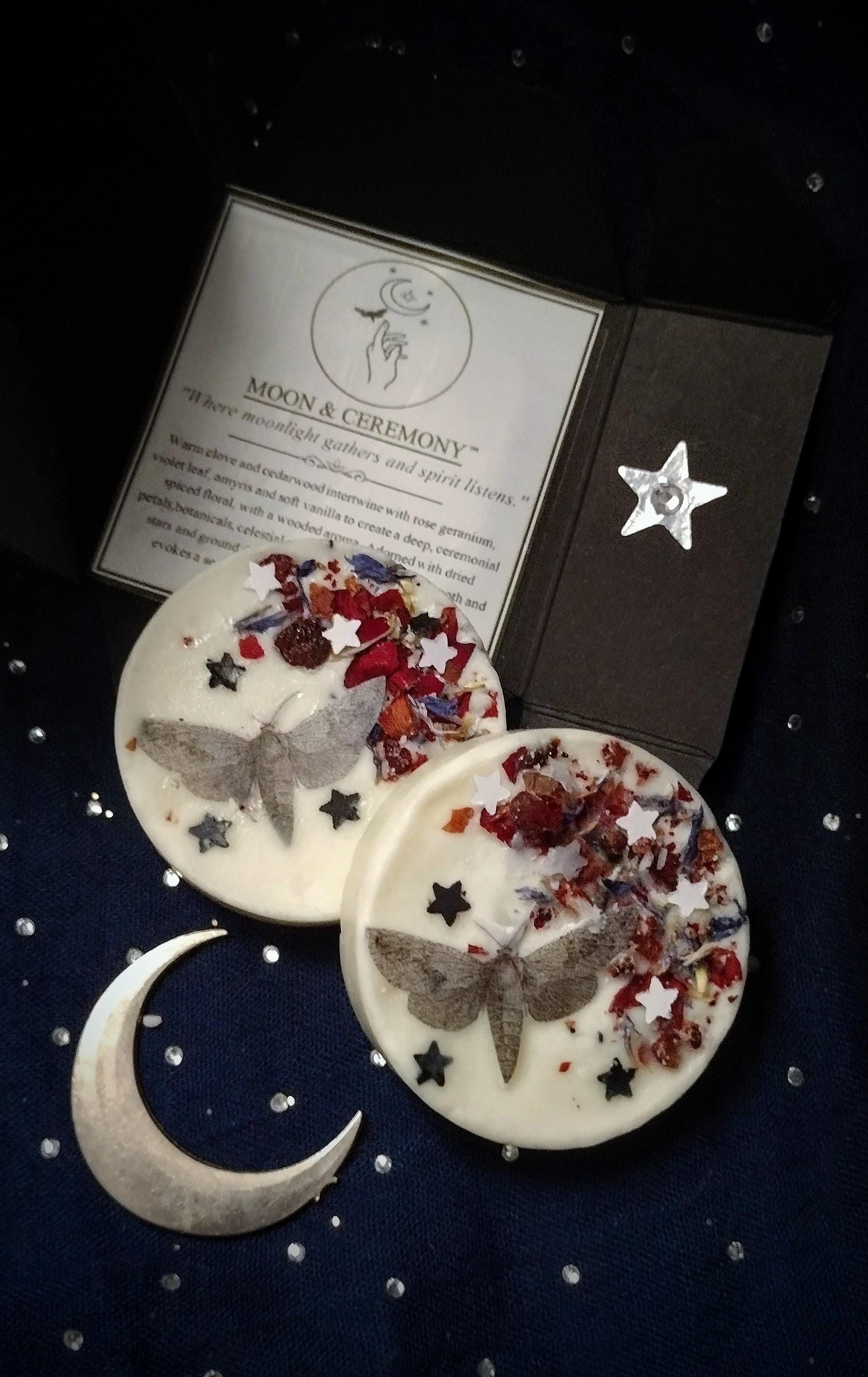 Warm clove and cedarwood intertwine with rose geranium, violet leaf, amyris and soft vanilla to create a deep, ceremonial spiced floral, with a wooded aroma. Adorned with dried petals, botanicals, celestial accents of mulberry paper moth and stars and ground dragon’s blood resin. This soy wax melt evokes a sense of sacred stillness under the moon for ceremonial evenings.